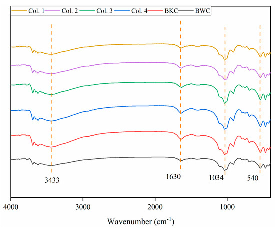 The PCA results for Col. 5 (Figure 9a) explained 71.4% of the total variance in the first two principal components (PC1 and PC2), indicating a satisfactory analysis [63]. In PC1 and PC2, reducible Cd and C16 exhibited similar loading values, with a small angle between them. Col. 6 also showed the similar PCA results (Figure 9b). These observations suggest that Cd and C16 share common sources and exhibit similar behavior [64,65]. Furthermore, the Pearson correlation analysis revealed a significant positive correlation between C16 and reducible Cd in Col. 5 (r = 0.88, p < 0.05) (Figure 9c). Our previous work demonstrated the interaction between the reducible fraction of Cd and C16 using batch experiments [66]. Compared with Col. 5, Col. 6 showed decreased zeta potential, increased CEC, and elevated pH (Table 4). Similar trends in these parameters were observed in BKC coated with C16 alone (Table S7), suggesting that C16 aging drives soil property modifications. Additionally, the functional groups showed minimal peak shifts during C16 aging (Figure 10), suggesting that this aging process only marginally affected the interaction between Cd and soils. It is noteworthy that the humic fractions in DOM increased as the aging period increased (Figure S2). This process may result in decreased C16 transport, enhanced C16 degradation, and increased Cd complexation [27,67,68,69], ultimately reducing interactions between Cd and C16 in Col. 6. Consequently, Col. 6 showed only a weak positive correlation between these variables (r = 0.26, p > 0.05) (Figure 9d). Moreover, despite changes in zeta potential, CEC, and pH in Col. 7 with extended aging to 90 days (Table 4), Cd primarily remained in the residual fraction. This suggests that other physicochemical characteristics of BWC potentially governed the environmental behavior of Cd, rather than C16 aging.