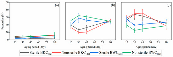 During the leaching processes, the C10−C16, C17−C21, and C22−C31 fractions exhibited layer-specific accumulation (Figure 2), driven by their distinct hydrophobicity and mobility [25,42]. The distribution of these fractions in Col. 1 differed significantly from those in Col. 2 (p < 0.05). However, leachate analysis showed similar C10−C31 proportions between the two columns (Figure 3a). Briefly, as aging increased to 90 days, BKC showed a decrease in the C10−C16 and C17−C21 fractions but an increase in the C22−C31 fraction. This finding is consistent with previous conclusions reported for soils in non-karst areas [24,43]. On the other hand, significant differences in C10−C31 content were observed between Col. 3 and Col. 4 in both the soil layer and leachate (p < 0.05) (Figure 2 and Figure 3a). Specifically, extended aging led to decreased C10−C16 contents but increased C17−C21 and C22−C31 contents in BWC.