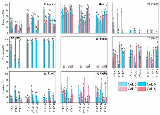 The vertical retention of C10−C16, Cd, and Pb in the column during leaching processes. LP is an abbreviation that denotes the leaching process. The capital letters T, M, and B represent the top, middle, and bottom layers at depths of 2.0, 5.5, and 9.0 cm below the ground surface, respectively. The capital letters A, B, C, and D represent the exchangeable, reducible, oxidizable, and residual fractions of Cd/Pb. All of the data are presented as mean ± standard deviation (n = 3). Different lowercase letters (a, b, c, and d) indicate significant differences in C10−C16/Cd/Pb levels among Col. 5–Col. 8 within the same soil layer (p < 0.05). Groups sharing the same letter are not significantly different.