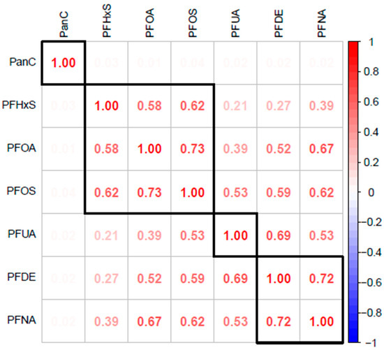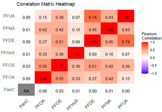The Spearman correlation matrix reveals the relationships between various PFAS, including PFOA, PFOS, PFHxS, PFUA, PFDE, PFNA, and PCSH.