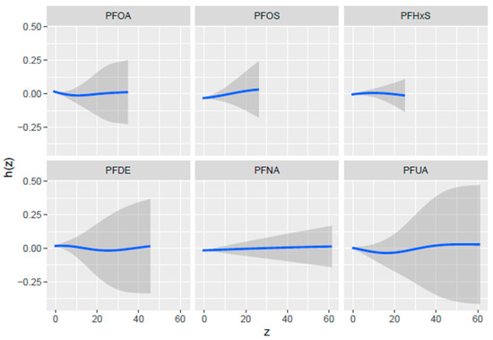 Univariate exposure-response functions with a 95% confidence interval for the relationship between each PFAS concentration when all other PFAS concentrations are fixed at the median. Adjusted for age, BMI, sex, and ethnicity. The blue line represents the estimate, and the gray area indicates the 95% credible interval.