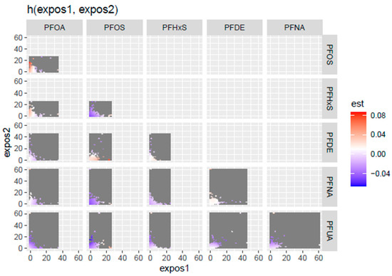 Figure 4 shows the bi-variate exposure-response function, examining the joint effects of PFASs on PCSH. The assessment involved investigating the effect of two PFAS concentrations while all others are fixed at a specific percentile and covariates are constant. The color scale (est) shows the estimated effect on PCSH—red indicates a higher positive effect, blue shows a negative effect, and white or grey indicates no effect. The results revealed that the most positive relationship was between PFOA and PFOS at low levels of both concentrations, which suggests a possible synergistic effect on PCSH risk.
