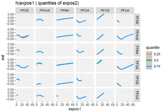 As depicted in Figure 5, PFOS (as expos 1) shows a consistent positive association with PCSH, revealing increasing interactions with PFDE, PFHxS, PFNA, and PFUA at the 0.75 quantile, with PFOA at the 0.5 and 0.75 quantiles.