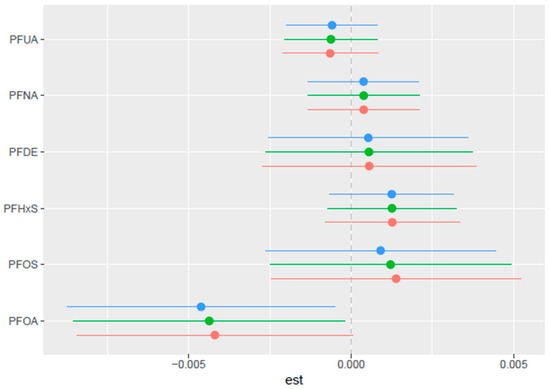 The single-variable effect, as shown in Figure 7, assesses the impact of each PFAS variable on PCSH. Figure 7 illustrates the estimated changes in PCSH when a particular exposure shifts from its 0.25 to its 0.75 quantiles, with all other exposures held constant at different quantiles (0.25, 0.50, or 0.75). Blue indicates the 0.75 quantile, green, the 0.5 quantile, and red, the 0.25 quantile. The plot gives an insight into which PFAS has the largest single variable effect and also gives an insight into the interaction of each PFAS with combined exposure to all the other PFASs, providing a comparison of the varying effects of each exposure variable on PCSH, based on the quantiles at which other exposures are held.