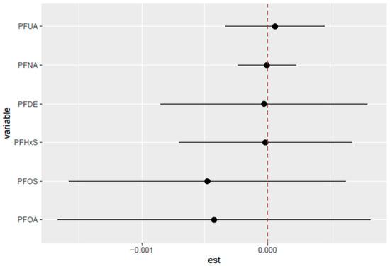Figure 8 highlights the single-variable interaction between PFAS exposures and their association with PCSH, with each horizontal line representing a 95% credible interval for the corresponding variable. The point estimates (black dots) indicate the magnitude and direction of each exposure’s association with PCSH, while the vertical red dotted line at zero represents the null effect. PFOA and PFOS show the most interaction with all other PFASs, as indicated by the deviation of the point estimates from the null effect.