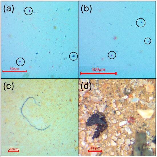 Visual analysis of the particles on the AlOx filters was conducted with a trinocular stereo zoom microscope (AmScope, Irvine, CA, USA) with a ring light and mount camera at 20× magnification. A full sweep of the filter was performed starting from the bottom left of the filter and reading from left to right, then moving up ‘one row’ and reading from right to left. This process was repeated until the whole filter was read. MP candidates were counted and classified based on color (e.g., blue, black, red) and categorized into different morphologies based on their shape (fibers, fragments, or pellets). Examples of the morphology of each class are shown in Figure 1. In general, elongated filaments were considered fibers, particles with irregular shapes were classified as fragments, and pellets had a well-defined round shape; black particles with irregular form and rubber-like texture were categorized as TRWPs. Particles with a mineral appearance (e.g., sediments, rocks or sand) were ignored during the counting. Particle size distribution analysis was performed using ImageJ software (version 1.54p).