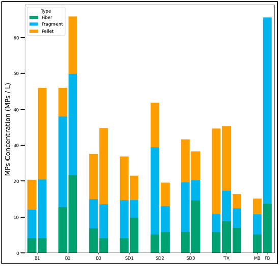 The concentration of MPs was estimated by normalizing the number of microplastics counted on each filter and dividing by the sample volume, as indicated in Equation (1):