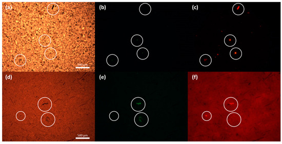 Comparative images from B1 (a–c) and SD2 (d–f) analyzed by fluorescence microscope through BF (a,d), GFP (b,e), and TxRed (c,f) filter sets. Some MP candidates show fluorescence only in one of the filter sets (either GFP or TxRed), while some others fluoresce in both.