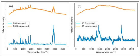 Raman spectra from two different particles present in the B3 inlet sample before and after being processed with OPUS Software. Fluorescence background from the particles is reduced after processing, allowing manual matching with PP (a) and HDPE (b) standards.