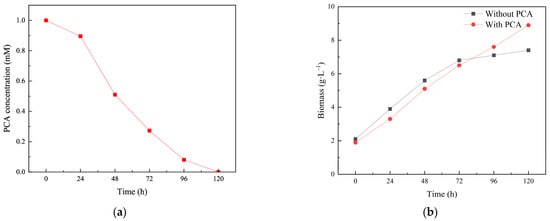 Since the toxicity of PCA may inhibit the growth of degrading bacteria and even lead to the death of degrading bacteria, the concentration of PCA will affect the degradation effect of degrading bacteria on PCA. The PCA-degrading bacteria Bacillus sp. had a degradation efficiency of 100% for PCA with a concentration lower than 100 mg·L−1, but the degradation efficiency of PCA dropped to less than 85% when the concentration of PCA increased to 150 mg·L−1 []. After 30 h culture, when the concentration of PCA in the medium was 300 mg/L, the OD600 of Thauera sp. M9 increased from 0.1 to 0.372 and the degradation efficiency was 100%, while when the concentration of PCA in the medium was increased to 400 mg·L−1 and 500 mg·L−1, the OD600 increased from 0.1 to 0.321 and 0.265, and the degradation efficiencies were 28% and 15%, respectively []. Similarly, Vangnai and Petchkroh reported that the growth of Acinetobacter baumannii CA2, Pseudomonas putida CA16 and Klebsiella sp. CA17 was almost completely inhibited when the concentration of PCA in the medium was increased from 0.2 mM to 1.6 mM []. When the PCA concentration increased from 180 mg·L−1 to 270 mg·L−1, the growth of Brevibacillus S-618 was inhibited, the cell dry weight decreased from 1.6 g·L−1 to 0.25 g·L−1, and the degradation efficiency of PCA decreased from 86.7% to 9% [].