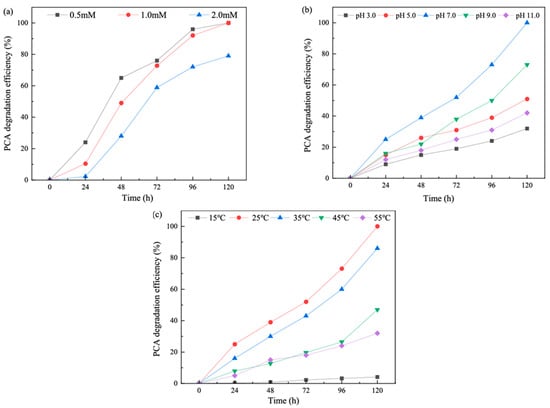 The effects of different initial concentrations of PCA on biodegradation were shown in Figure 4a. The PCA biodegradation by Isaria fumosorosea SP535 decreased with the increase in PCA concentration within the experimental concentration range. When the initial concentration of PCA was 0.5 mM (6.38 mg·L−1) and 1.0 mM (12.76 mg·L−1), the degradation efficiency of PCA by Isaria fumosorosea SP535 reached 100% within 120 h. When the initial concentration of PCA was further increased to 2.0 mM (25.51 mg·L−1), the degradation efficiency of PCA by Isaria fumosorosea SP535 decreased to 79%. This indicated that Isaria fumosorosea SP535 can effectively degrade PCA at a concentration below 1.0 mM.