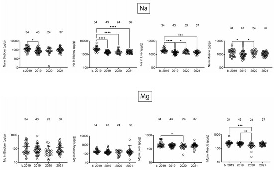 Figure 1. Na and Mg concentrations (µg/g) in blubber, kidney, liver, and muscle. Numbers above scatter dots represent the number of bottlenose dolphins with the metal/metalloid in their tissue. Total sample size: b. 2019 = 42; 2019 = 43; 2020 = 24; 2021 = 37. *, **, ***, **** difference between indicated groups at p < 0.05, 0.01, 0.001, or 0.0001, respectively.