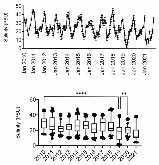 Figure 2. Salinity measures in MSS. Data were obtained from USGS. Timeline depicts average salinity per month, with peaks in winter months and troughs in summer months. Box and whisker plots depict mean and 95% confidence intervals. **, **** difference as compared to 2019 (only 2019 and 2021 were not different). PSU, practical salinity units.