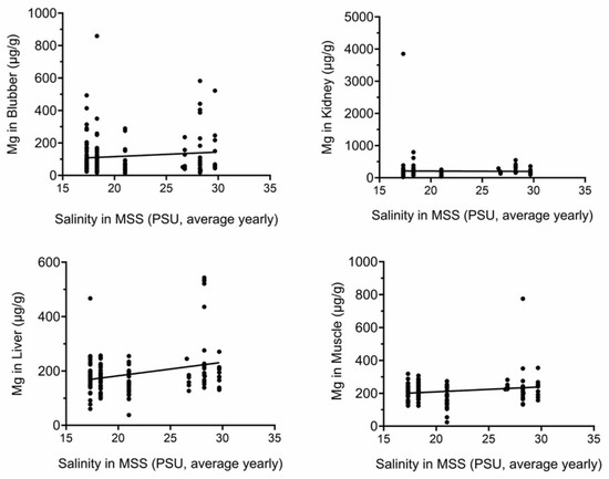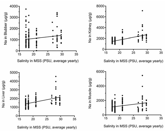 Figure 3 and Figure 4 show that there are significant positive correlations between average yearly water salinity in the MSS with Na in all tissues and with Mg in liver and muscle.