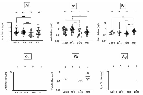 Figure 5. Toxic/heavy metal/metalloid (Al, As, Ba, Cd, Pb, Ag) concentrations (µg/g) in blubber. Numbers above scatter dots represent the number of bottlenose dolphins with the metal/metalloid in their tissues. Total sample size: b. 2019 = 42; 2019 = 43; 2020 = 24; 2021 = 37. *, **, ***, **** difference between indicated groups at p < 0.05, 0.01, 0.001, or 0.0001, respectively.