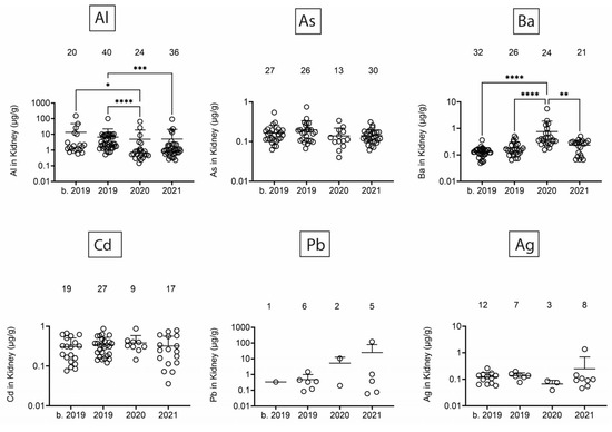 Figure 6. Toxic/heavy metal/metalloid (Al, As, Ba, Cd, Pb, Ag) concentrations (µg/g) in kidney. Numbers above scatter dots represent the number of bottlenose dolphins with the metal/metalloid in their tissues. Total sample size: b. 2019 = 42; 2019 = 43; 2020 = 24; 2021 = 36. *, **, ***, **** difference between indicated groups at p < 0.05, 0.01, 0.001, or 0.0001, respectively.