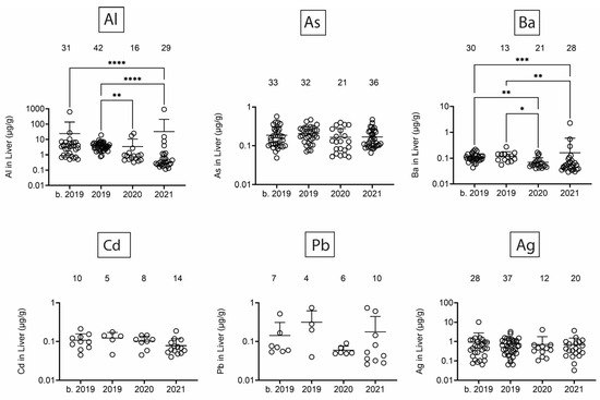Figure 7. Toxic/heavy metal/metalloid (Al, As, Ba, Cd, Pb, Ag) concentrations (µg/g) in liver. Numbers above scatter dots represent the number of bottlenose dolphins with the metal/metalloid in their tissues. Total sample size: b. 2019 = 42; 2019 = 43; 2020 = 24; 2021 = 37. *, **, ***, **** difference between indicated groups at p < 0.05, 0.01, 0.001, or 0.0001, respectively.
