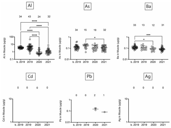 Figure 8. Toxic/heavy metal/metalloid (Al, As, Ba, Cd, Pb, Ag) concentrations (µg/g) in muscle. Numbers above scatter dots represent the number of bottlenose dolphins with the metal/metalloid in their tissues. Total sample size: b. 2019 = 42; 2019 = 43; 2020 = 24; 2021 = 37. *, ***, **** difference between indicated groups at p < 0.05, 0.01, or 0.0001, respectively.