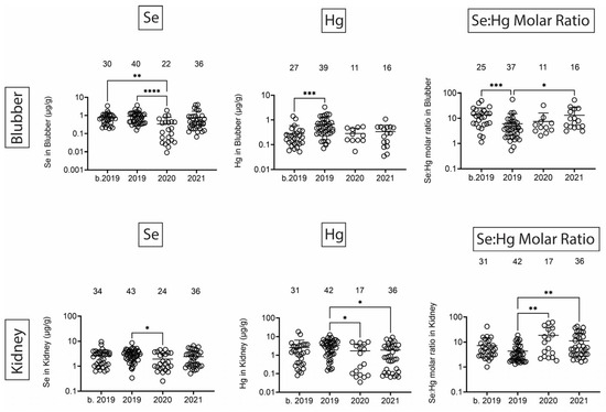 Figure 9. Se and Hg concentrations (µg/g) in blubber and kidney. Numbers above scatter dots represent the number of bottlenose dolphins with Se or Hg in their tissues. Plots on the right side are molar ratios of Se:Hg. Total sample size: b. 2019 = 42; 2019 = 43; 2020 = 24; 2021 = 37 for liver, 36 for kidney. *, **, ***, **** difference between indicated groups at p < 0.05, 0.01, 0.001, or 0.0001, respectively.