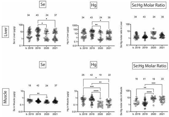 Figure 10. Se and Hg concentrations (µg/g) in liver and muscle. Numbers above scatter dots represent the number of bottlenose dolphins with Se or Hg in their tissues. Plots on the right side are molar ratios of Se:Hg. Total sample size: b. 2019 = 42; 2019 = 43; 2020 = 24; 2021 = 37. *, **, ***, **** difference between indicated groups at p < 0.05, 0.01, 0.001, or 0.0001, respectively.