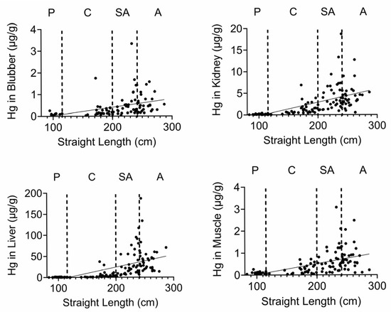 Figure 11. Hg tissue concentrations correlate with straight length. Hg concentrations (µg/g) were plotted against dolphin length (cm). All correlations were significant.