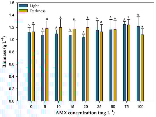 Final biomass of the cultures of C. reinhardtii exposed to different concentrations of AMX in both light and darkness. Different letters denote significant differences (p < 0.05) between the different initial concentrations of AMX in light (upper case letters) and in darkness (lower case letters).