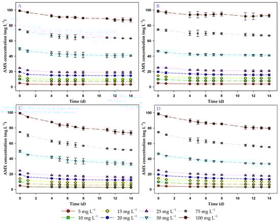 Evolution over time of AMX concentration (mg L−1) in the medium using living C. reinhardtii biomass, considering biomass alone in light (A), biomass alone in darkness (B), biomass + abiotic degradation in light (C) and biomass + abiotic degradation in darkness (D).