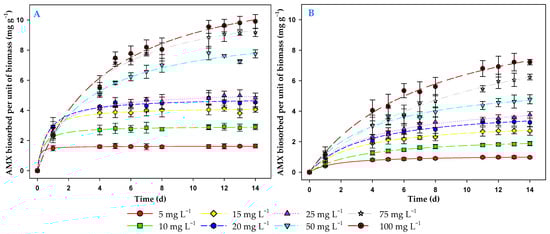 To determine the efficiency of the biosorption process, it is useful to use the contact time required to reach a given removal value when equilibrium is reached. Figure 3 illustrates the evolution of the amount of AMX removed per unit of biomass. In this figure it can be seen that the amount of AMX per unit of biomass increased over time until equilibrium was reached at all concentrations tested. At the lowest antibiotic concentrations, equilibrium could be reached in about two days. In contrast, at the highest concentration tested (100 mg L−1), equilibrium was reached in about 12 days. Therefore, a 14-day assay was sufficient time to characterize the biosorption process at all tested AMX concentrations.