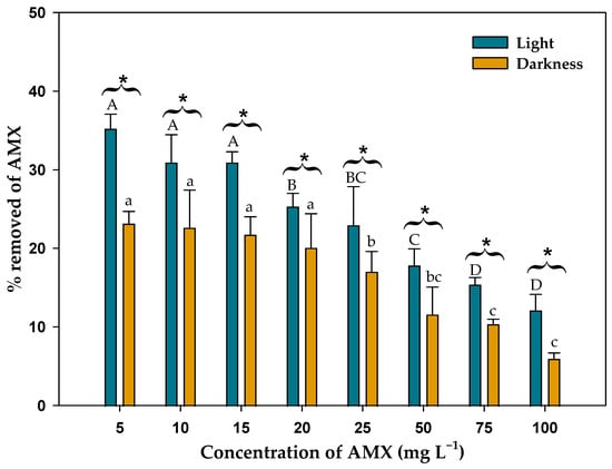 Percentage removed of AMX by the biomass of C. reinhardtii in light and darkness after 14 days. Different letters denote significant differences (p < 0.05) between the different initial concentrations of AMX in light (upper case letters) and in darkness (lower case letters). * Indicates significant difference (p < 0.05) between light and darkness.