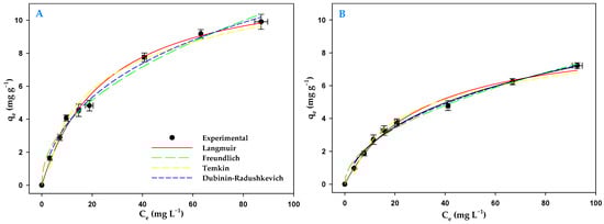 Equilibrium isotherm of AMX biosorption by microalgal biomass in light (A) and in darkness (B).