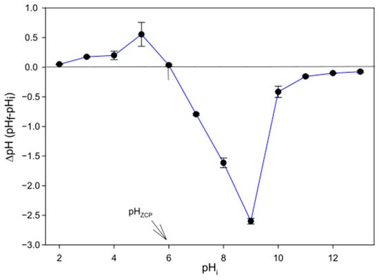 The zero charge point (pHzcp) determines the pH value at which the biomass charge is zero. To determine the pHzcp, an amount of microalgal biomass of 1.1 g L−1 was used. This biomass was previously obtained by centrifugation at 6000× g × 2 min. This biomass was resuspended in 0.125 M NaCl solutions with different pHs from 2–13 (pHi). After 4 h of contact, the solutions were centrifuged at 6000× g × 2 min to obtain the supernatant, and the final pH of these supernatants was measured (pHf). The pHzcp was obtained from a plot of ΔpH (pHf–pHi) against pHi. All pH measurements were made on a pH meter Basic 20 (Crison, Hospitalet de Llobregat, Barcelona, Spain).
