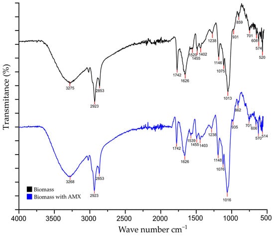 Comparing the wavenumbers of the characteristic peaks of the biomass, such as 3275, 2923, 1520, 1238, 1146 and 1013 cm−1 with those after AMX biosorption, there was a shift and/or increase at 3268, 2923, 1539, 1238, 1148 and 1016 cm−1. The band around 3275–3268 cm−1 was more prominent due to the -OH present in AMX, which could interact with the biomass through hydrogen bond formation [46]. The peak at 2923 cm−1 also increased after biosorption, which could be due to the -COOH vibrations of the carboxyl groups present in AMX [47]. The observed shift in peaks 1539, 1148 and 1016 cm−1 could be due to the interaction with AMX. The increase in the peak at 1238 cm−1 can be associated with the C=C stretching of the benzene ring of AMX [48]. These results confirm that AMX interacted with the living biomass of the microalga during the biosorption process.