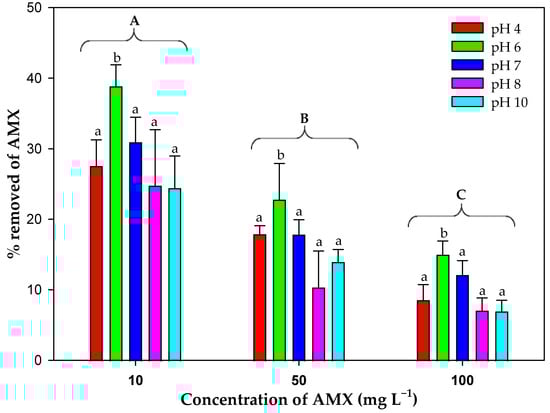 Percentage of AMX removed by microalgal biomass after 14 days depending on the pH and initial concentration. Different letters denote significant differences (p < 0.05) in the percentage of AMX removal at the different pHs tested (lower case), and between the initial AMX concentrations (upper case).