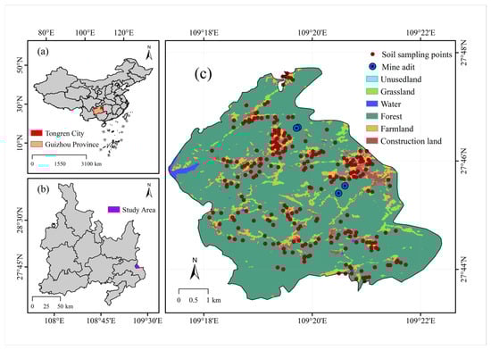 Map of the study area. (a) China Map, (b) study area, (c) Land use types and location of mines in the study area.
