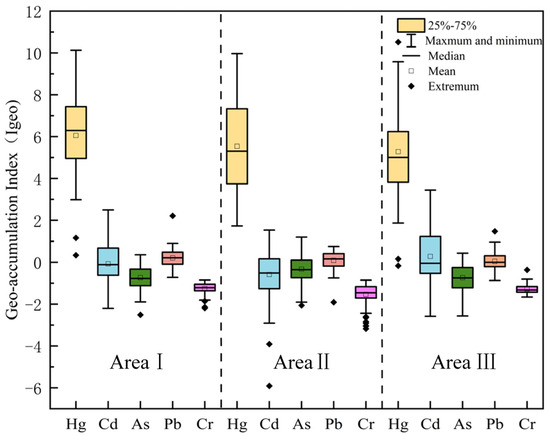 where Igeo is the Geo-accumulation Index; is the measured concentration of the i-th heavy metal, mg·kg−1. is the background value of the i-th heavy metal. K is a conversion factor used to eliminate variations in background values caused by differences in local rocks, with a value of 1.5. Categorization of the Geo-accumulation Index (Igeo) is shown in Table S1. The background values of Hg, Cr, As, Pb, and Cr in the region are 0.13, 0.4, 13.48, 33.57, and 98.98 in mg/kg [21,22].