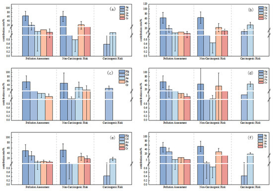 Contribution of soil heavy metals to soil contamination, evaluating non-carcinogenic and carcinogenic risk. (a,b) Area I—adult and children; (c,d) Area II—adult and children; (e,f) Area III—adult and children.