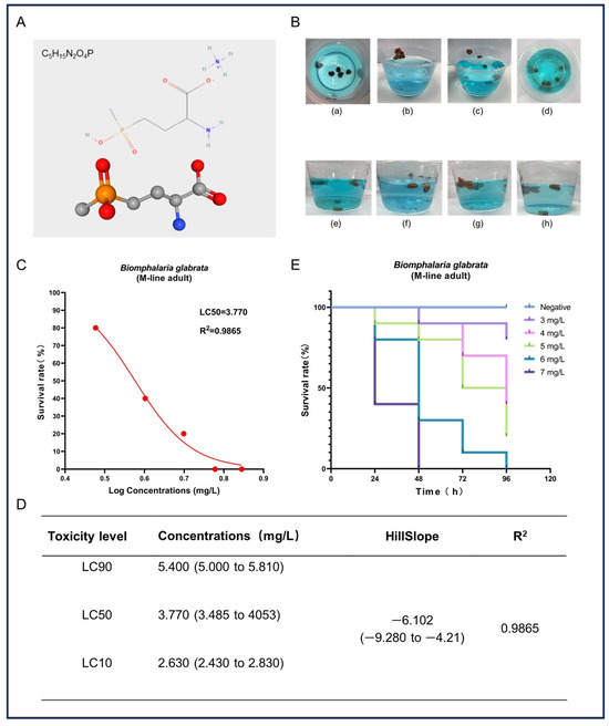 Acute toxicity effects of GLA on adult B. glabrata. (A) The upper part shows the chemical structure of GLA, and the lower part presents its ball-and-stick model. (B) Behavior and physiological changes of B. glabrata in water containing GLA: (a) When B. glabrata comes into contact with GLA solution (concentration range: 3–7 mg/L), it exhibits shell-retracting behavior; (b,c) In the low-concentration groups (3 mg/L, 4 mg/L) and medium-concentration groups (5 mg/L, 6 mg/L), snails are observed to escape, expel mucus, and change their positions in the water; (d) In the high-concentration group (7 mg/L) at the beginning of the experiment, a large number of individuals die; (e–h) show the distribution of snails in the low-concentration groups (3 mg/L, 4 mg/L) and medium-concentration groups (5 mg/L, 6 mg/L) in a 300 mL solution. (C) Non-linear regression analysis of dose-survival rate of adult B. glabrata exposed to GLA. (D) LC10, LC50, and LC90 values calculated based on the dose-survival rate fitting curve, 95% confidence intervals, curve slope, and R2 value. LC10: Concentration at which 10% of the experimental individuals die; LC50: Lethal concentration 50%; LC90: Lethal concentration 90%. (E) Survival curves of adult B. glabrata exposed to different concentrations of GLA, showing survival rates over time (96 h).
