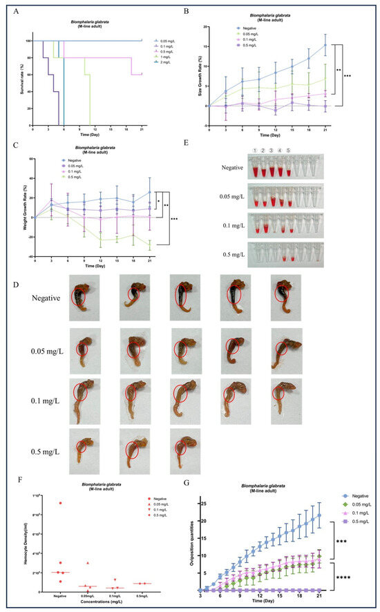 During sub-lethal dose chronic exposure experiments, we found that even at relatively low concentrations, the lifespan of B. glabrata was very short, with all individuals dying within 6 days, especially at concentrations of 4 mg/L and 2 mg/L. Even individuals that survived at lower exposure concentrations (such as 0.05 mg/L, 0.1 mg/L, and 0.5 mg/L) exhibited significant inhibition of shell diameter and body weight growth, with particularly noticeable negative growth at 0.5 mg/L. Notably, these concentrations are achievable in natural environments.