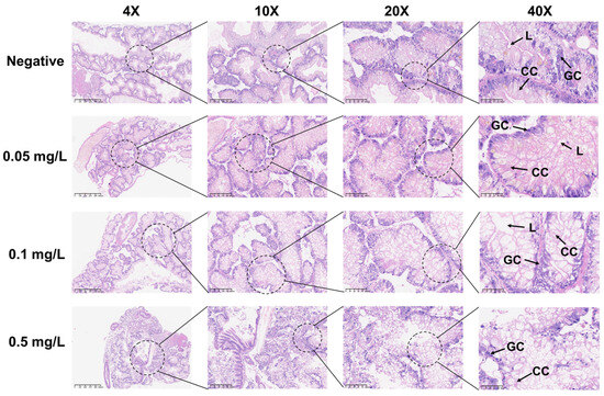 Histopathological changes in the hepatopancreas of adult B. glabrata exposed to GLA. Representative HE-stained sections of hepatopancreatic tissues after 21 days of exposure to different concentrations of GLA (from top to bottom: negative control, 0.05 mg/L, 0.1 mg/L, and 0.5 mg/L). The magnifications from left to right are 4× (scale bar = 625 μm), 10× (scale bar = 200 μm), 20× (scale bar = 100 μm), and 40× (scale bar = 50 μm). The figure labels the lumen (L), granular cell (GC), and cylindrical cell (CC).