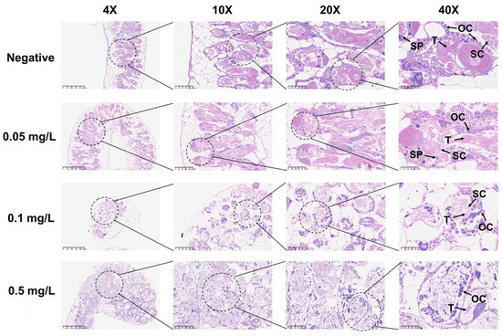 Histopathological changes in the reproductive glands of adult B. glabrata exposed to GLA. Representative HE-stained sections of reproductive gland tissues after 21 days of exposure to different concentrations of GLA (from top to bottom: negative control, 0.05 mg/L, 0.1 mg/L, and 0.5 mg/L). The magnifications from left to right are 4× (scale bar = 625 μm), 10× (scale bar = 200 μm), 20× (scale bar = 100 μm), and 40× (scale bar = 50 μm). The figure labels the ovary cell (OC), testis (T), spermatic cord (SC), and sperm (Sp).