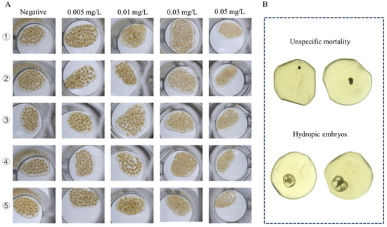 Embryo mortality was recorded every 24 h across the 120-h exposure period. In parallel, survival rate (SR), hatching rate (HR), and developmental status were evaluated daily using a Motic stereoscopic digital microscope. The embryonic developmental process was also documented at 24-h intervals using a high-definition digital imaging system (Moticam S5) until the conclusion of the experiment.