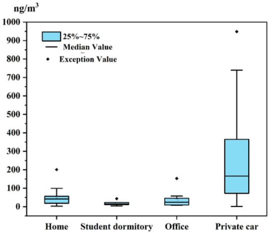 The automobile interior represents another critical indoor microenvironment with pronounced OPE contamination. Although daily exposure duration in vehicles is generally shorter than in residential or office settings, OPE concentrations measured within car compartments frequently exceed those of other indoor environments. He et al. [] analyzed dust samples from offices, public spaces, and automobiles in Nanjing, reporting the highest OPE levels in vehicle dust—16-fold and 6-fold greater than office and public microenvironment samples, respectively. Ali et al. [] observed similar trends in Kuwaiti and Pakistani vehicles, where OPE concentrations in automobile dust were approximately five times higher than in residential or workplace dust matrices. Brommer et al. [] compared OPE levels in dust from UK automobiles, school classrooms, homes, and offices, identifying tris(1,3-dichloro-2-propyl) phosphate (TDCIPP) as the dominant congener in vehicles with significantly elevated concentrations relative to other microenvironments. Brandsma et al. [] further reported TDCIPP in car seat dust at 1100 μg/g—the highest concentration documented in the literature to date—highlighting automotive interiors as hotspots for OPE accumulation. While existing research confirms elevated OPE pollution in vehicle compartments, current investigations are overwhelmingly focused on dust matrices, with limited data available on airborne concentrations and associated human exposure risks. A recent screening assessment demonstrated that partial dust removal interventions in vehicles fail to reduce human contact with OPEs, implying the existence of additional exposure pathways beyond dust-mediated routes []. These findings underscore the urgent need for a comprehensive evaluation of airborne OPE levels in private vehicles. As the average person spends over 200 h per year in vehicles, understanding the exposure risks in this confined microenvironment is crucial for developing effective mitigation strategies. In this study, passive air sampling was employed to collect air samples from four distinct indoor microenvironments—residential homes, offices, student dormitories, and private vehicles. This method offers several advantages over traditional active sampling techniques, including lower cost, longer sampling duration, and reduced disturbance to the indoor environment. The research aims to systematically investigate the concentration profiles and pollution characteristics of OPEs across these environments, characterize their potential emission sources, and assess the human exposure risk.