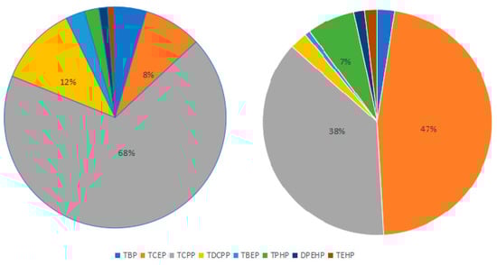 Among the analyzed compounds, tris(2-chloroethyl) phosphate (TCEP) was the most abundant OPE congener, with a mean concentration of 18.01 ng/m3, followed by tris(2-chloropropyl) phosphate (TCPP, 14.52 ng/m3) and triphenyl phosphate (TPHP, 2.61 ng/m3). The compositional profile of indoor air OPEs followed the order: TCEP (46.6%) > TCPP (37.6%) > TPHP (6.8%) > TDCPP (2.5%) > TBP (2.4%) > TEHP (1.8%) > DPEHP (1.5%) > TBEP (0.8%) (Figure 2, Left). Chlorinated OPEs dominated the mixture, accounting for 84.2% of total concentrations, with TCEP and TCPP as the primary homologs—consistent with findings from Lai et al. in Northern Chinese atmospheric fine particles []. Notable compositional differences were observed compared to global studies: TCPP and triethyl phosphate (TEP) accounted for 43% and 33% of U.S. air samples [], while TCPP, triisobutyl phosphate (TiBP), and tri-n-butyl phosphate (TnBP) represented 45%, 28%, and 12% in German air []. In Dalian, China, TCPP (74%), TBP (12%), and TDCPP (5%) dominated the profile []. These disparities reflect regional regulatory and usage patterns: since 2016, the U.S. and EU have restricted TCEP due to its neurotoxic and carcinogenic properties, leading to increased reliance on TCPP as a substitute—explaining its elevated presence in those regions. In this study, the high abundance of TCEP and TCPP can be attributed to multiple factors: their relatively high saturated vapor pressures facilitate volatilization from materials, combined with environmental persistence due to slow degradation rates. Additionally, their historical widespread use in China for flame retardancy in plastics, foams, and textiles likely contributes to their dominant presence in indoor air.