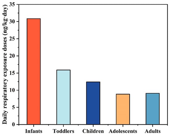 In this study, the Monte Carlo algorithm was employed to calculate the daily respiratory exposure doses of different populations, using the total indoor air concentrations of OPEs measured in homes, offices, student dormitories, and private cars in Guangzhou. The results are presented in Table 3. Infants exhibited the highest exposure level, with a mean daily exposure of 30.85 ng/kg/day, followed by toddlers and children, whose mean daily exposures were 15.89 ng/kg/day and 12.41 ng·kg−1·d−1, respectively. Adolescents and adults had lower daily respiratory exposures compared to infants, toddlers, and children. A general trend of decreasing daily OPE exposure levels in indoor ambient air with increasing age was observed among different populations. When compared with other studies, the mean daily exposures of young children and adults to indoor air OPEs in homes in Beijing were 2.1 ng/kg/day and 1.2 ng/kg/day, respectively []. In Australia, the daily respiratory exposures of young children and adults to indoor air OPEs were 7 ng/kg/day and 7.9 ng/kg/day [], both of which were lower than those of the corresponding age groups in this study. The relatively high exposure levels of OPEs in the indoor ambient air observed in this study might be attributed to the elevated OPE concentrations detected in the microenvironment of private cars.