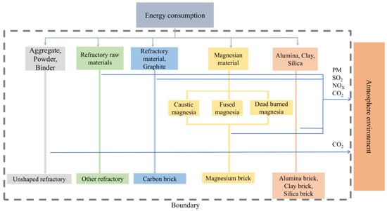During the process, after a series of production procedures, various refractory products such as alumina bricks, clay bricks, silica bricks, magnesia bricks, carbon bricks, and unshaped refractory materials are finally formed and are output as the system within the boundary range [].
