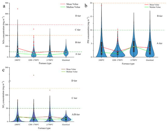 In Figure 2a, the lowest and highest average PM concentrations among the 21 furnaces with a temperature of ≤800 °C were 0.35 and 19.04 mg m−3, respectively, and the median concentration was 1.81 mg m−3. Of the four types of furnaces (those operated in the aforementioned three ranges and those powered electrically), those operating at the lowest temperatures had the widest distribution of PM concentrations. In total, 86 companies used furnaces that operated at 1200–1700 °C; the lowest and highest PM concentrations for these furnaces were 0.14 and 10.32 mg m−3, respectively, and the median concentration was 1.24 mg m−3. Nonetheless, of the four types of furnaces, those that operated at 1200–1700 °C emitted the smallest amounts of overall pollutants and had the most concentrated distribution (primarily in the range 0–5.0 mg m−3).