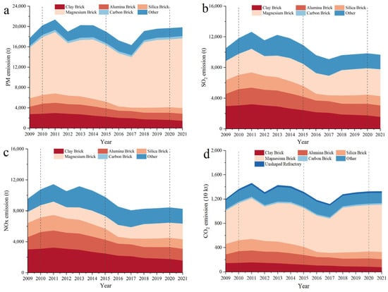 Air pollutants and CO2 of refractory products, 2009–2021: (a) PM, (b) SO2, (c) NOx, and (d) CO2.