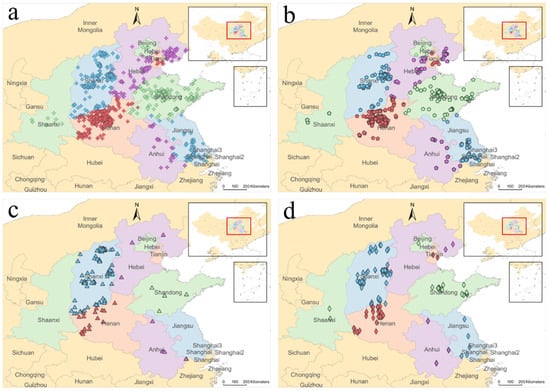 Energy consumption in key areas of refractory production by province: (a) electricity, (b) gas, (c) coal, and (d) oil. The symbols in the figure represent the locations of refractory material production enterprises.