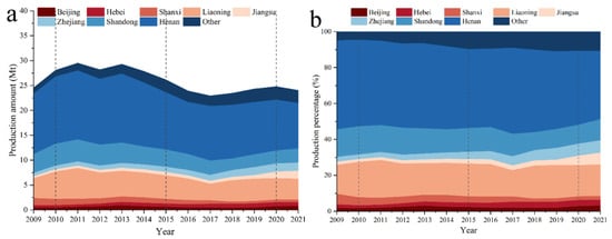 Changes in refractory production in provinces in China, 2009–2021: (a) the output of refractory materials in each province, and (b) the proportion of refractory materials output in each province.