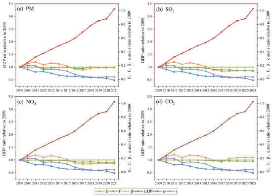 Parameters such as total pollutant emission, control technology level, economic development level (GDP), economic structure, and consumption structure are illustrated in Figure 6. These parameters were normalized such that their value in 2009 was 1. Overall, emissions trended down. From 2009 to 2021, refractory production in China decreased; however, refractory material output did not change. After 2012, under the control of the government, the pollution production coefficient decreased, and source control measures were improved. The emission coefficients of PM, SO2, NOx, and CO2 decreased by 2.1%, 13.9%, 9.7%, and 5.1%, respectively.